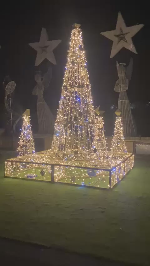 Transform your holiday festivities into a grand spectacle with our extraordinary 12ft Golden Stage featuring a stunning Christmas tree centerpiece. This monumental piece of festive lighting is designed to be the crowning jewel of your seasonal celebrations.