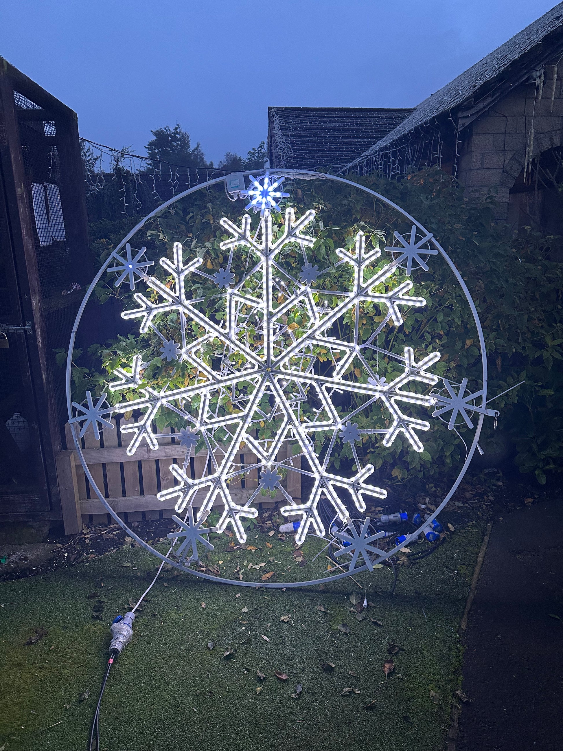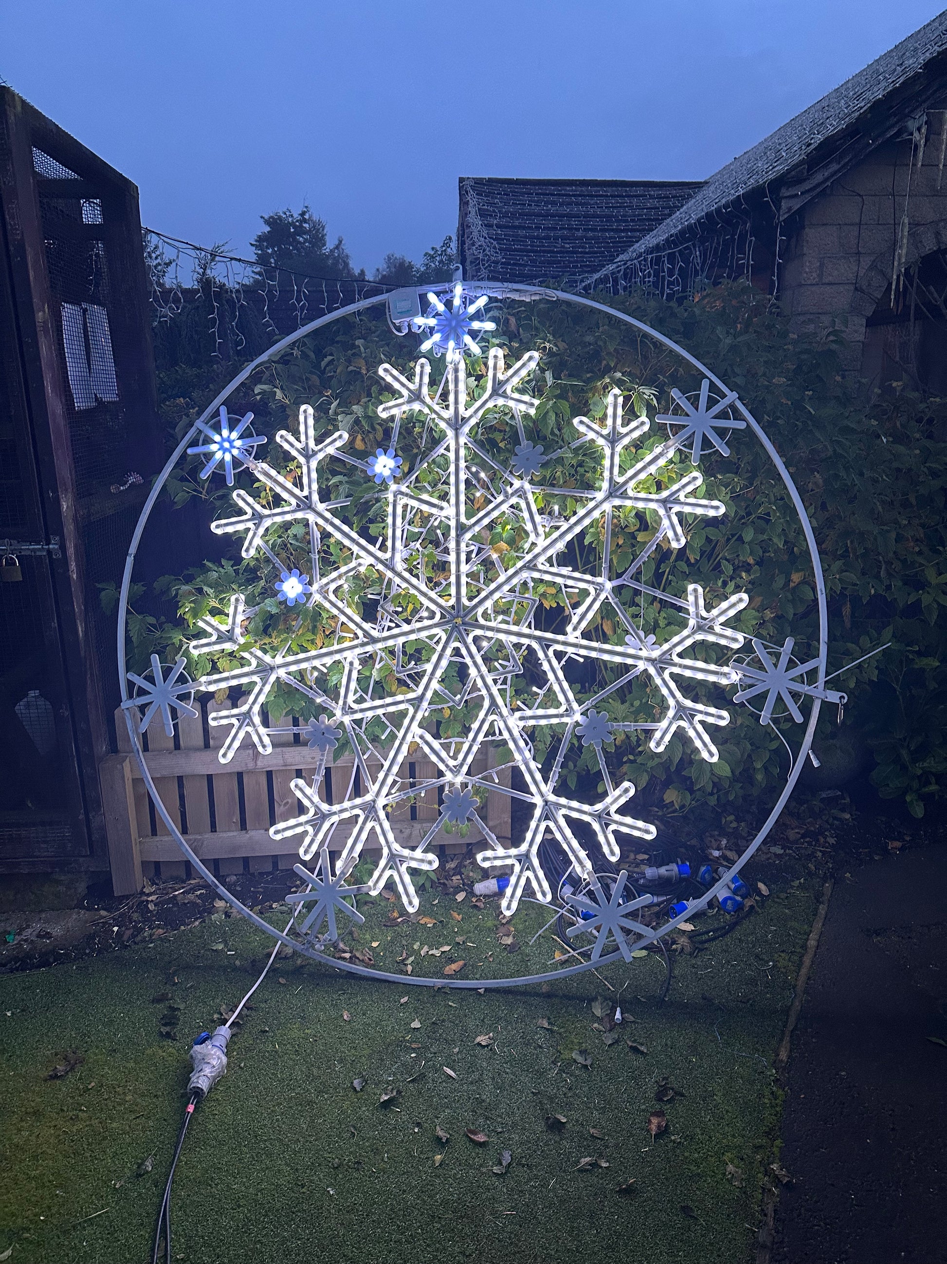 Introducing our spectacular Large Snowflake Wheel – a mesmerizing piece of holiday decor that's bound to captivate and enchant. This extraordinary snowflake wheel, measuring an impressive 2.63 meters in size, is now available in superb condition, having been lightly used and thoughtfully maintained.