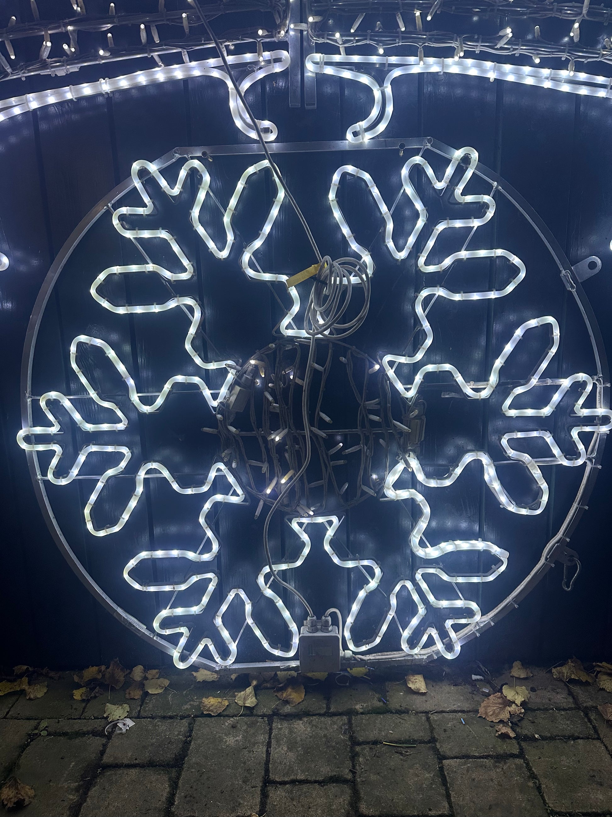 Introducing our spectacular Large Snowflake Wheel – a mesmerizing piece of holiday decor that's bound to captivate and enchant. This extraordinary snowflake wheel, measuring an impressive 2.63 meters in size, is now available in superb condition, having been lightly used and thoughtfully maintained.