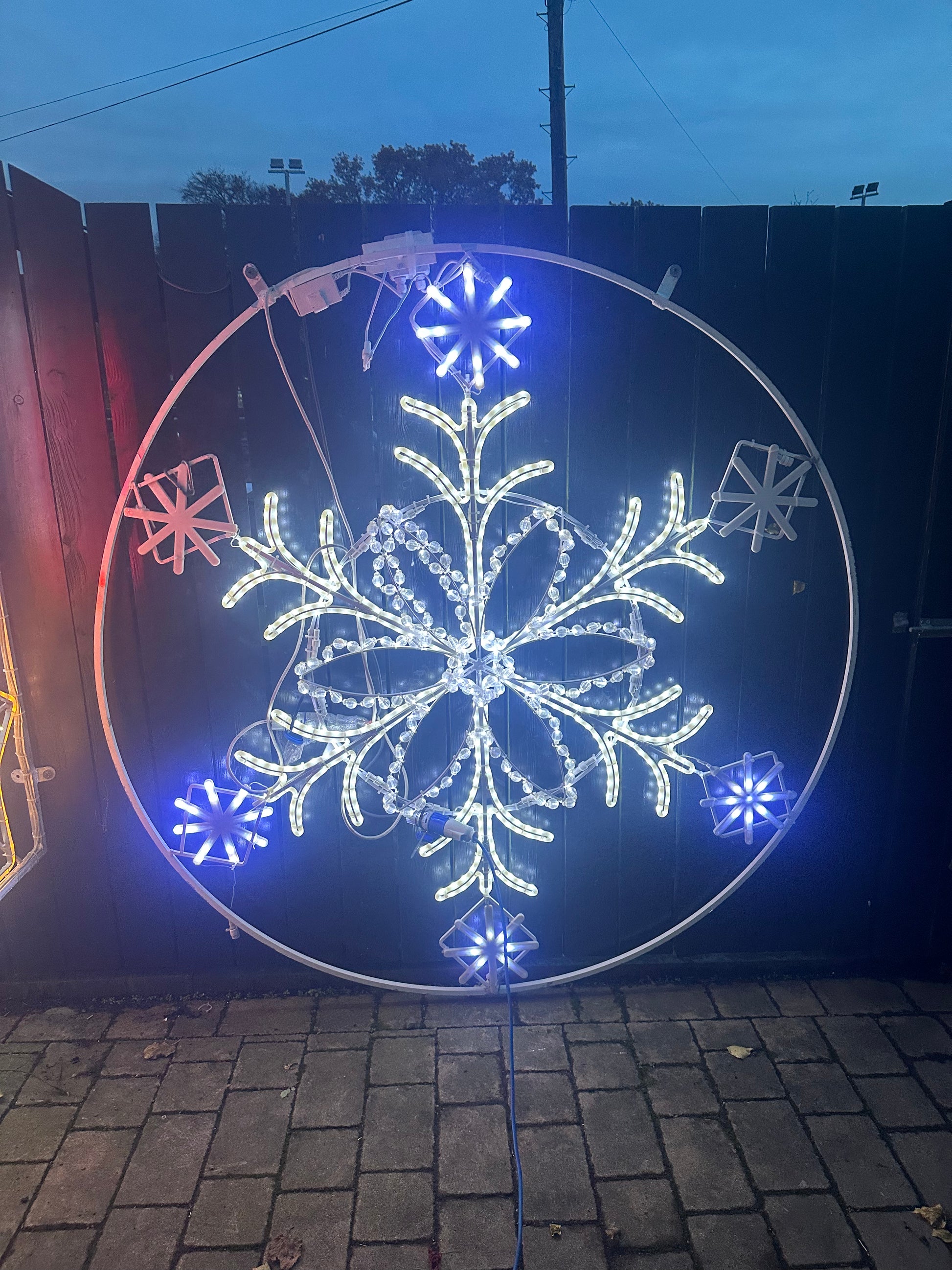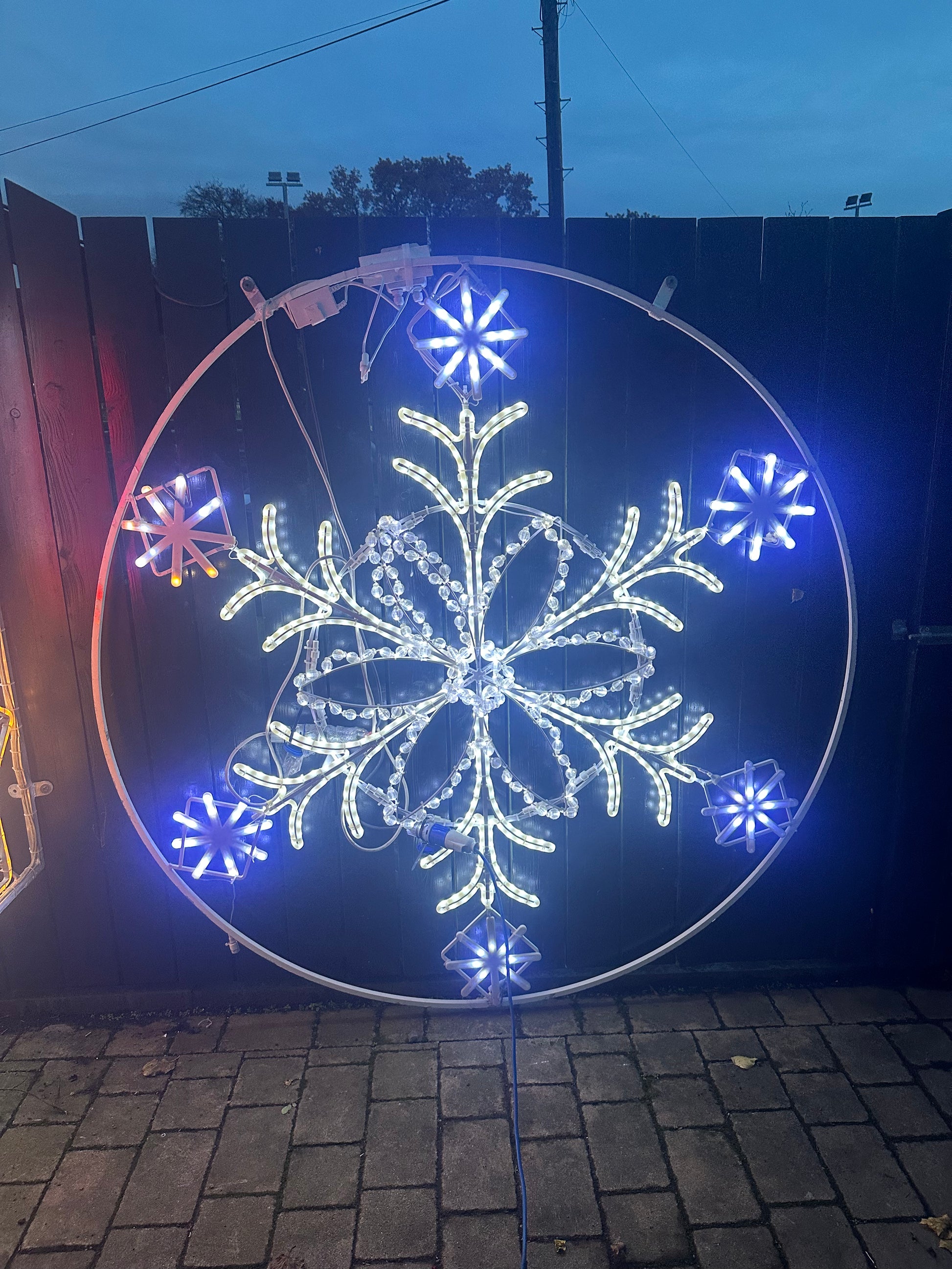 Introducing our spectacular Large Snowflake Wheel – a mesmerizing piece of holiday decor that's bound to captivate and enchant. This extraordinary snowflake wheel, measuring an impressive 2.63 meters in size, is now available in superb condition, having been lightly used and thoughtfully maintained.
